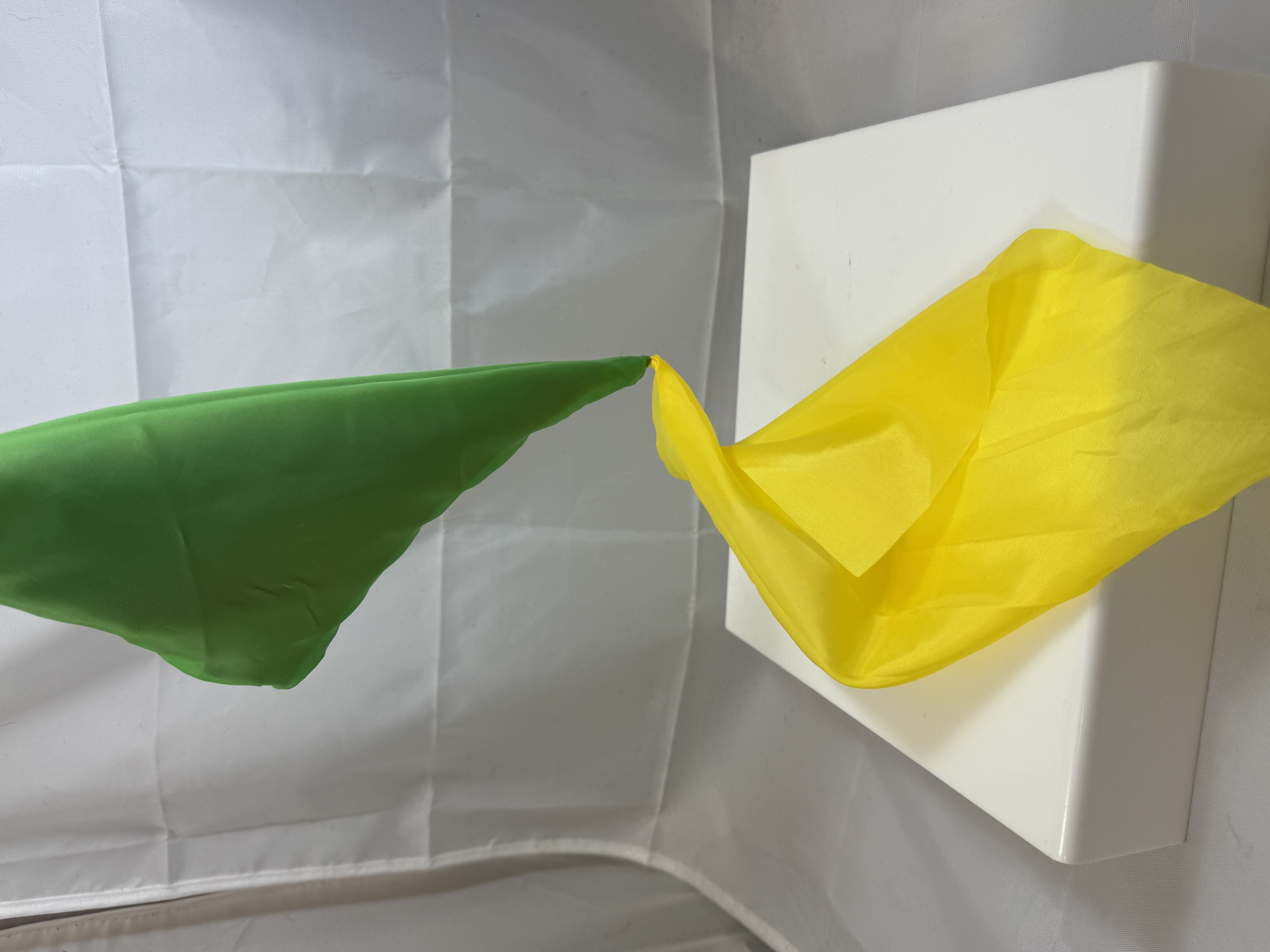 - Two handkerchiefs visibly change into two new colors!